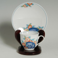 鍋島伝統文様。平安鎌倉時代、宮中で用いられた牛車のことを御所車と呼びます。その牛車の車輪と宮中の桜、御所桜を組み合わせた文様です。大変雅(みやび)な意匠で、華やかな印象の珈琲カップです。